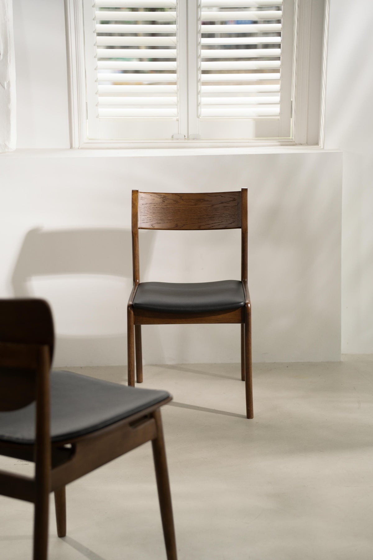 Solid tropical hardwood frame and oak veneer backrest. Features premium leather seat upholstery with elegant dark brown finish. Engineered for refined comfort and enduring style.