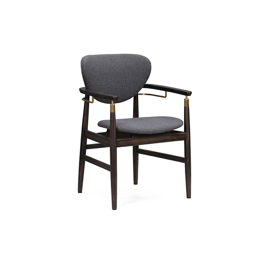 The Linate Arm Chair offers a touch of modern elegance and comfort to your dining space. Crafted with a beautiful smoked solid American oak frame, the chair exudes a sleek and sophisticated look. Brass accents on the chair back and armrests add a touch of warmth and glamour. Upholstered in fabric, the spacious seat and backrest provide both comfort and style, inviting you to linger at the table. This versatile arm chair is perfect for adding a touch of luxury to your dining room, and pairs well with a variety of dining tables and design aesthetics.