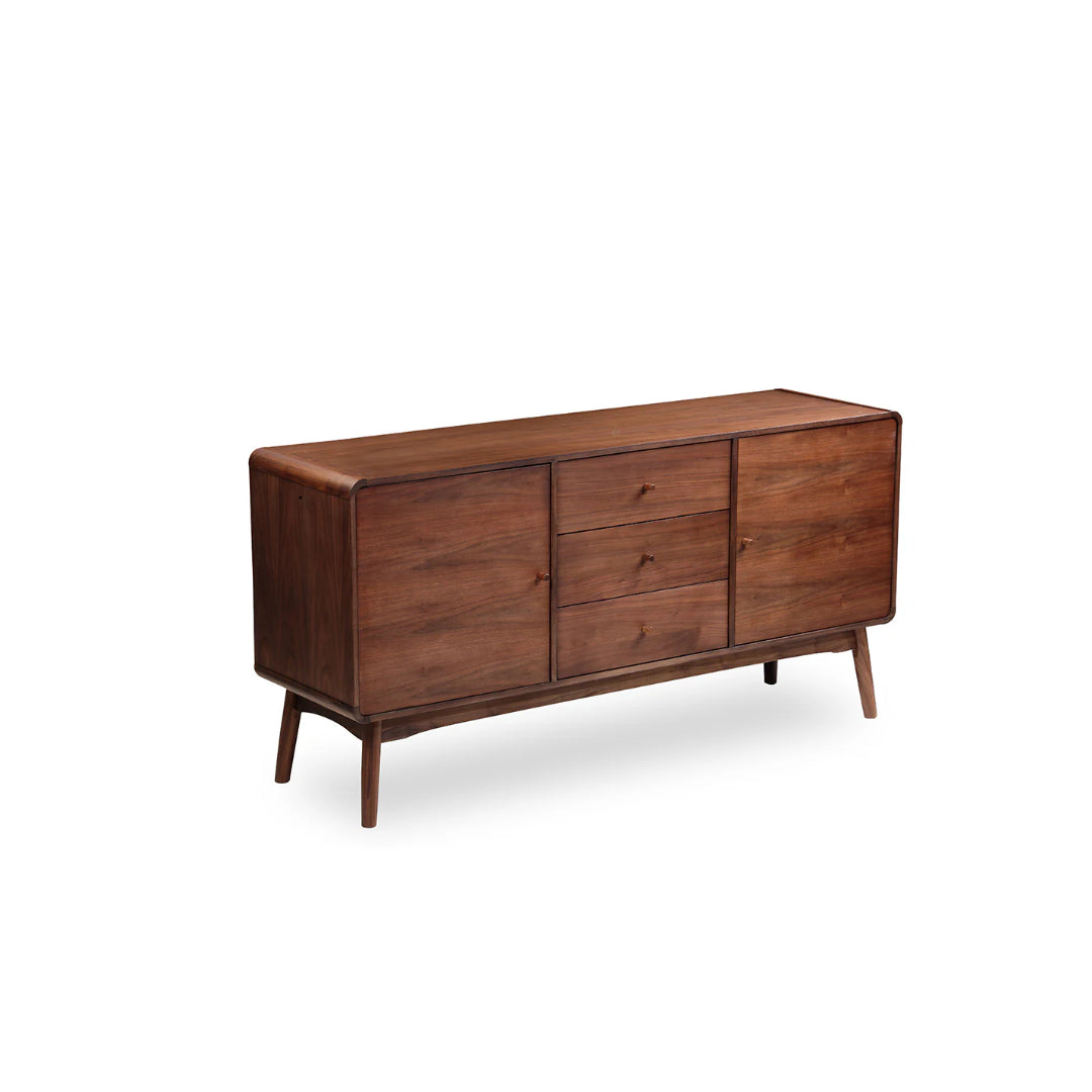Indulge in the exquisite craftsmanship of the Bowen Sideboard. Made with solid American walnut legs, the sleek knob handles and rounded corners add a touch of sophistication. The top and panels feature a walnut veneer overlay on engineered wood, elevating the design to a luxurious level.