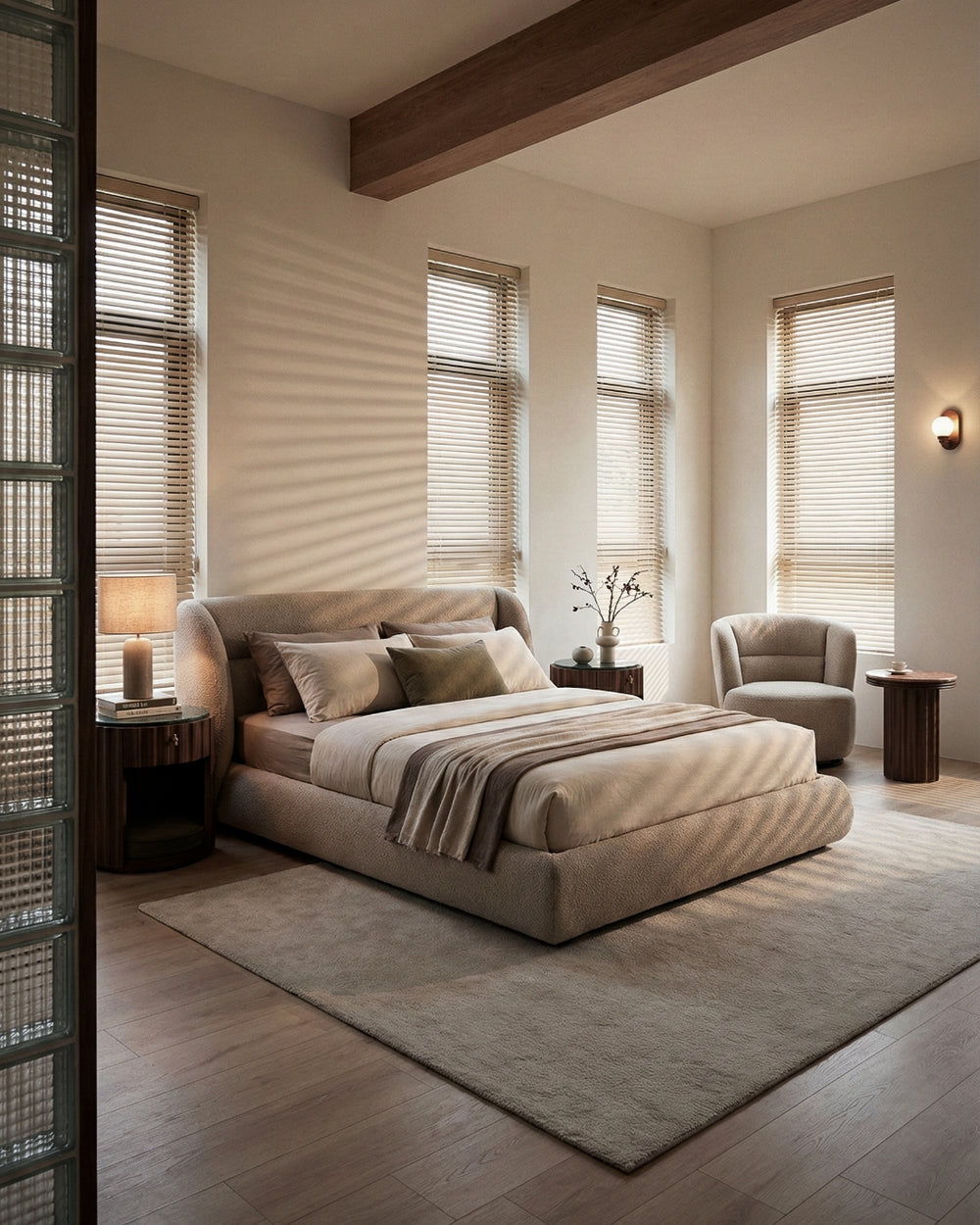 - Low-Profile Beds: Sleek, space-enhancing platforms that don’t require a box spring. Ventilated slats promote mattress health and keep the bedroom visually calm and open.