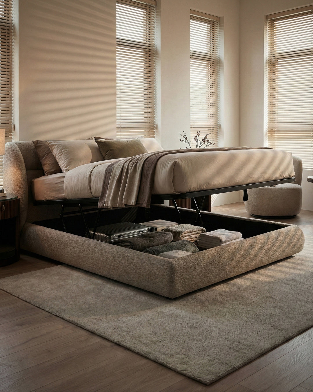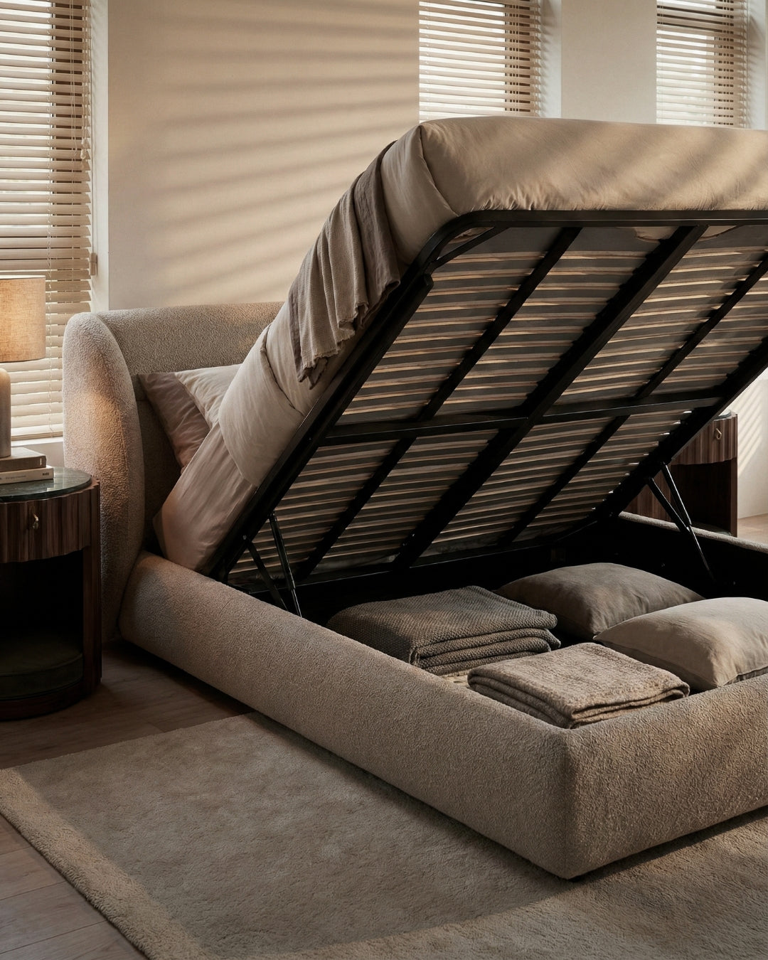 The Hotel Paradiso Bed Frame redefines bedroom elegance with its organic, sculptural silhouette. Featuring wing-like curves that create an embracing headboard, this piece draws inspiration from 1970s mid-century modern design. The plush, high-density foam construction ensures both comfort and durability, while a practical lifting mechanism provides easy-access storage space. Its understated sophistication delivers both timeless allure and modern functionality.