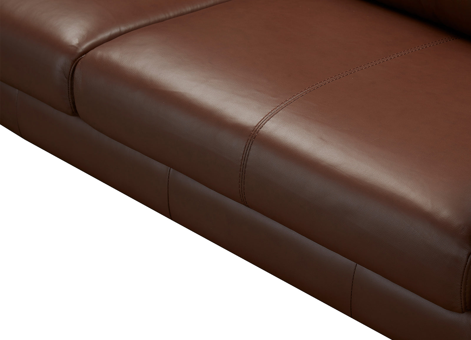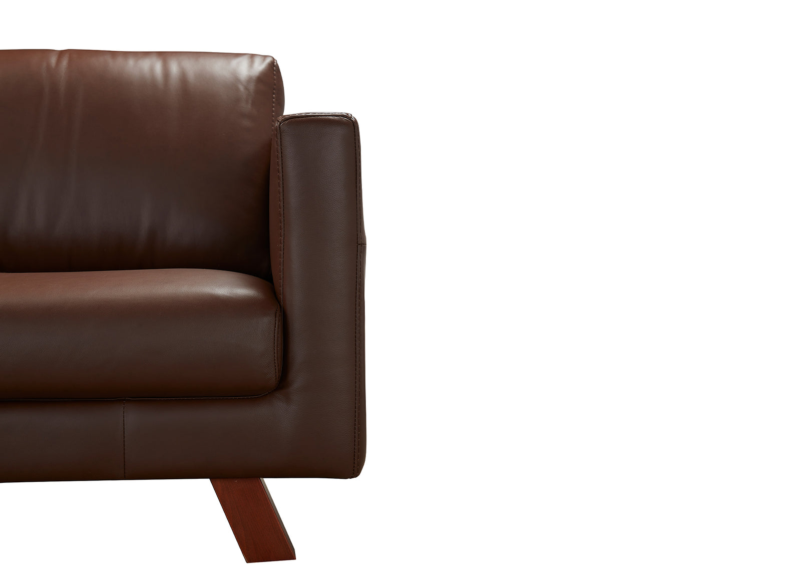 With its clean, straight lines and boxy silhouette, this sofa is a statement piece for any sophisticated living space. The middle stitching on the seats adds a touch of refined detail, while the angled block solid wooden legs provide a sturdy and stylish foundation. Imagine a classic leather couch that evokes the indulgence of a rich, chocolate-layered cake—luxurious, inviting, and utterly irresistible. The Geormani Sofa is not just a piece of furniture; it's an experience in comfort and timeless style.