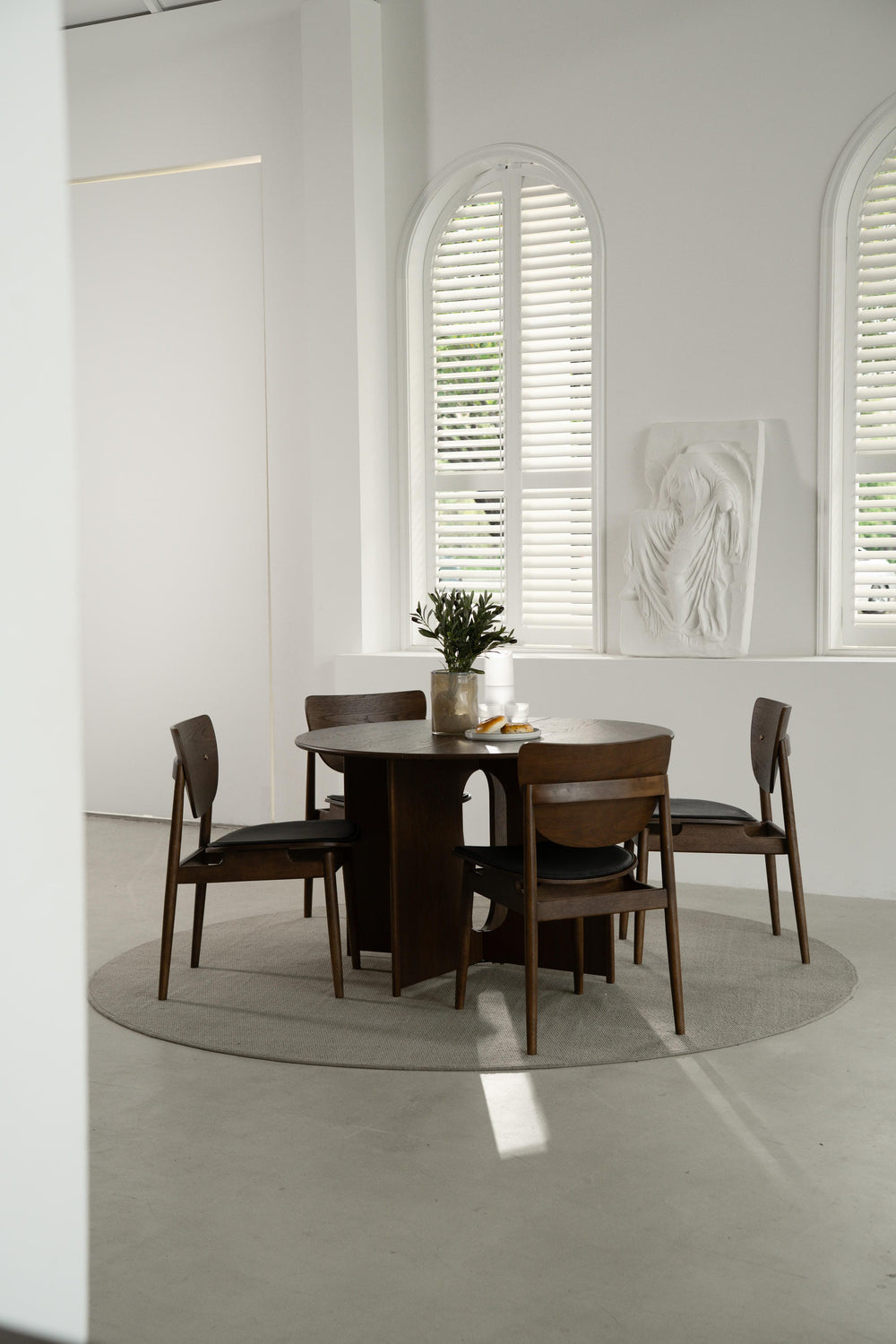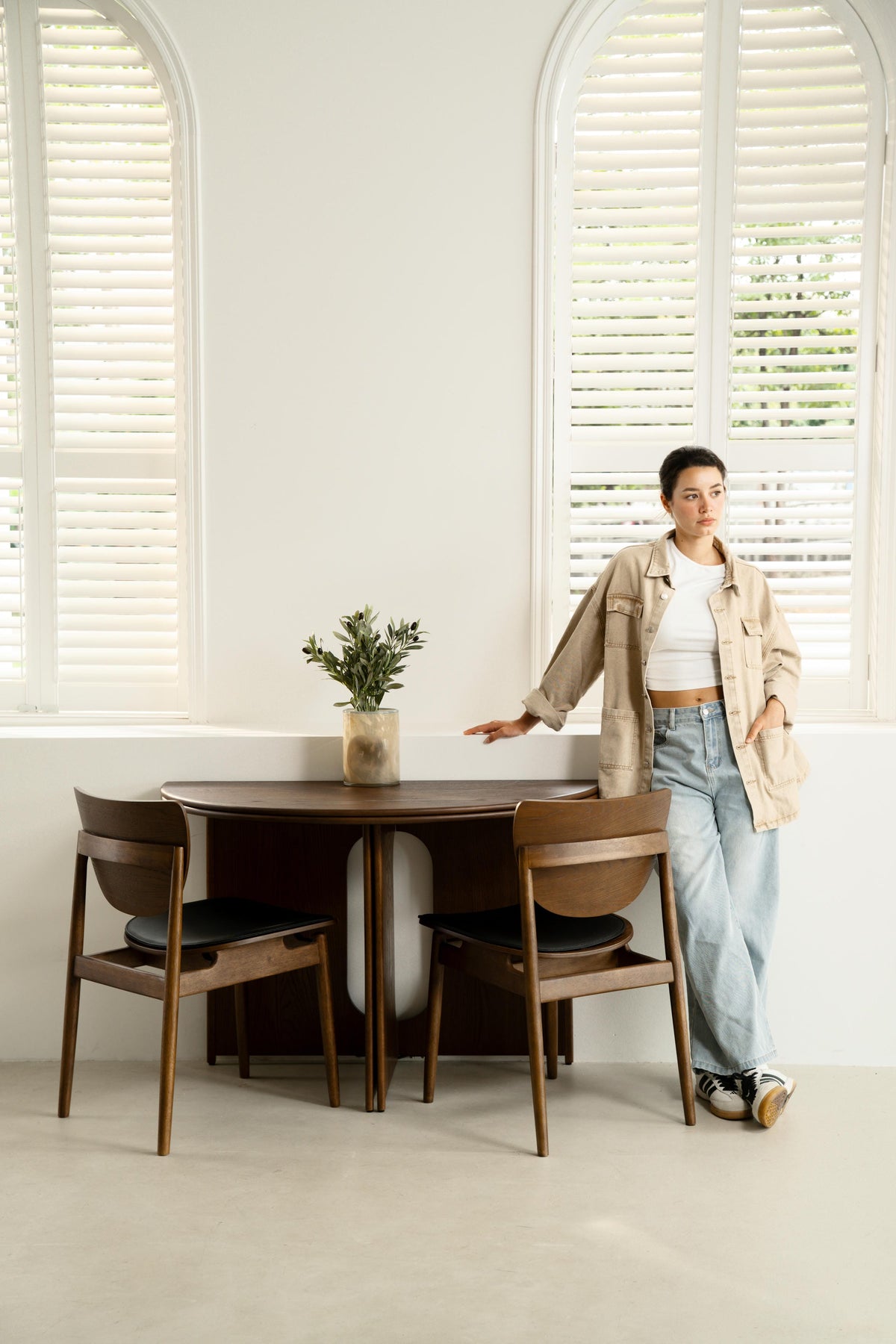 Precision-engineered table showcasing solid oak edging and oak veneer construction. Top and leg panels demonstrate superior wood craftsmanship, enhanced by a rich dark brown finish. Features an integrated half-fold system for versatile space management.