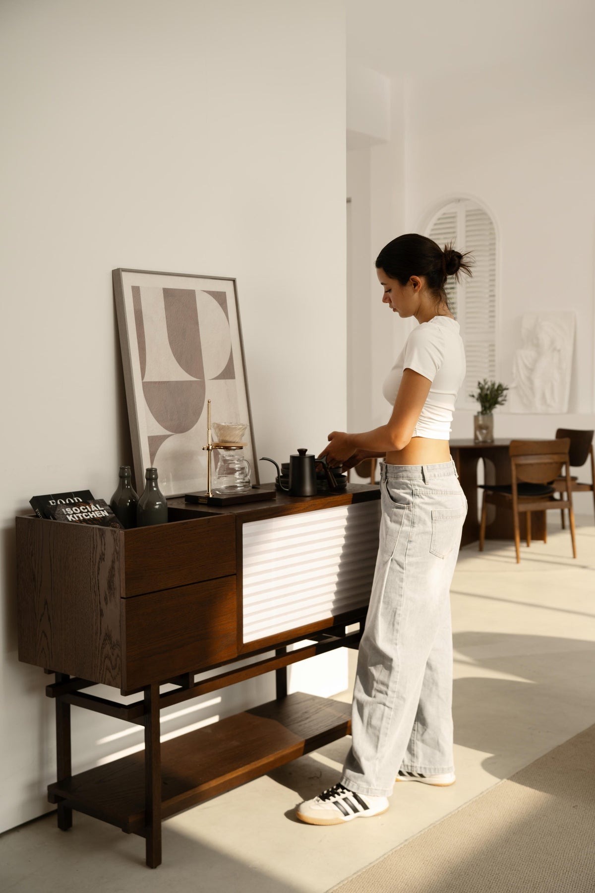 Crafted with American white oak frame and legs, this piece harmonizes with oak veneer panels for a seamless aesthetic. Premium soft-closing mechanisms elevate both drawer and acrylic-faced flip door functionality. The design's signature element emerges through touch-controlled LED lighting, casting an ethereal glow through pleated polyester fabric panels - creating a lantern-like ambiance. Concealed tropical hardwood support rails provide robust structural stability while maintaining the clean lines of the design.